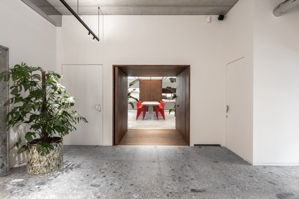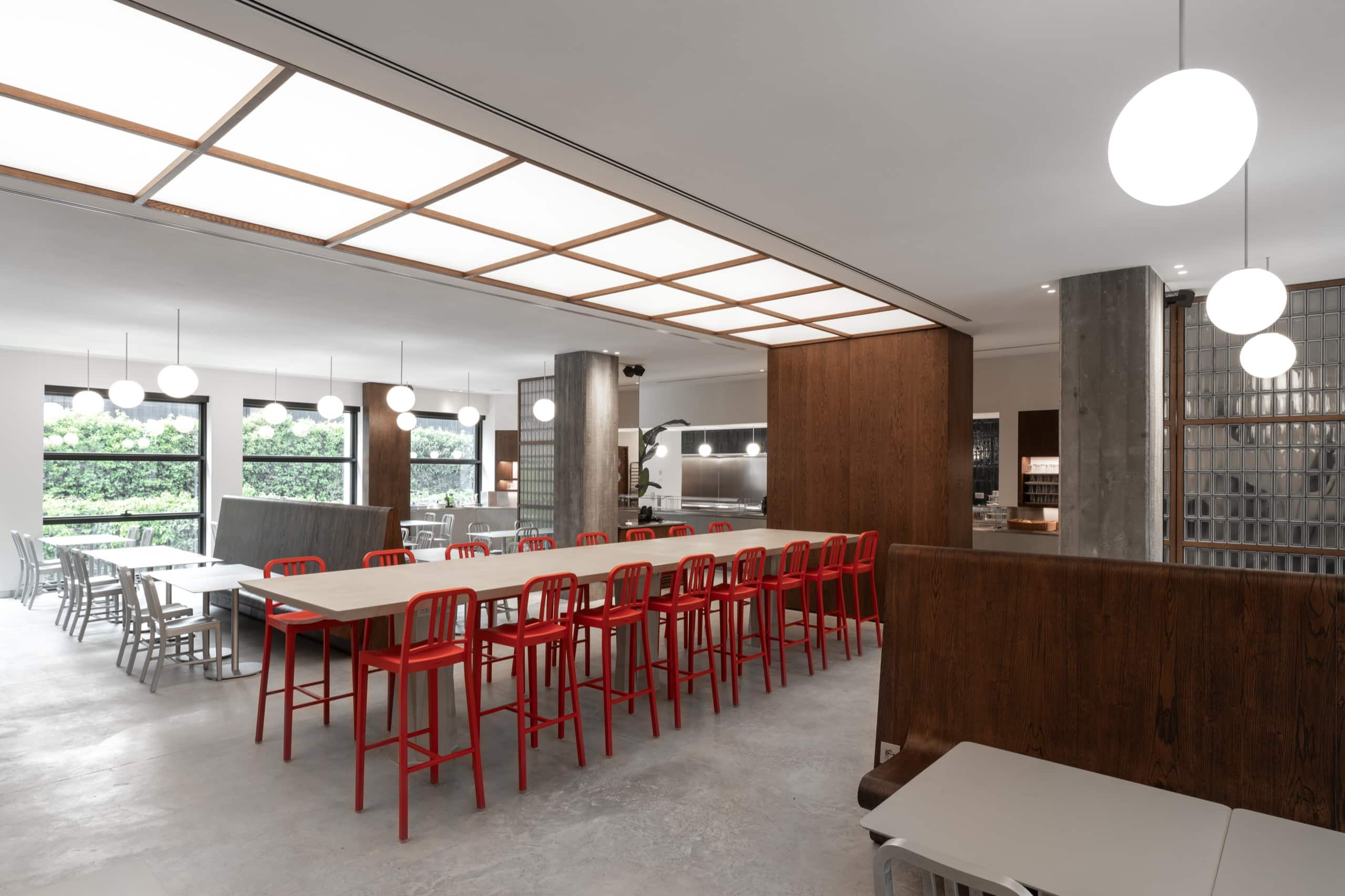 La poetica dello spazio, che nasce dalle affascinanti atmosfere industriali degli anni 50, vede l’impiego di semplici elementi in legno di rovere tinto che rendono raffinato l’ambiente. La morbidezza e la semplicità delle panche, poi, sono una chiara citazione ad Alvar Aalto mentre il tavolo centrale “Last Supper” è una dichiarazione d’amore a Pier Luigi Nervi e al suo operato. L’esecutore si è mosso magistralmente con ingegnosità tra le aspettative, il rigore del progetto e la velocità”.
